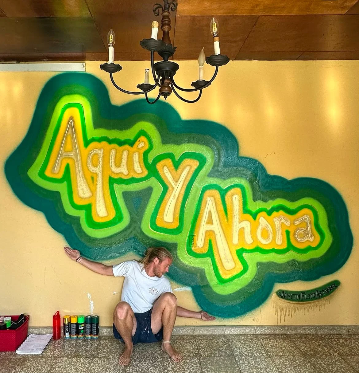 A mural in the common area of a hostel in Juayua, El Salvador. The phrase means “Here & Now” in Spanish.